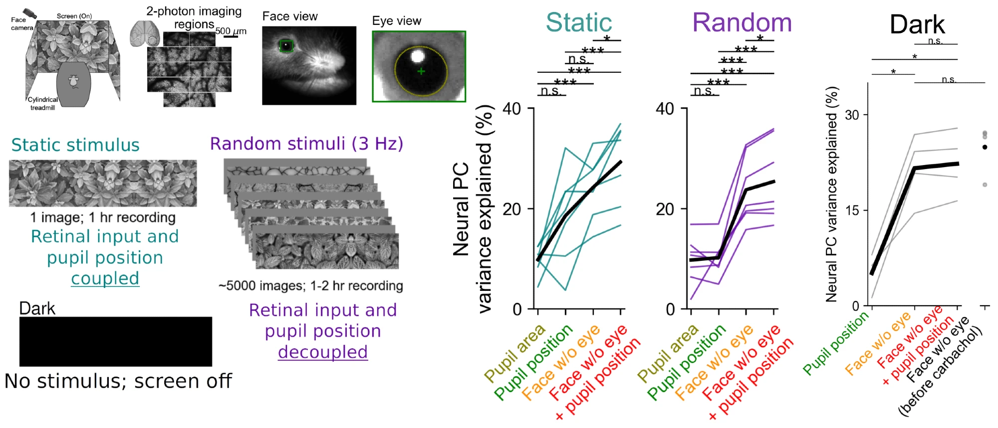 This led to the suggestion that the modulation may primarily depend on eye movements in both species (Kang et al 2025). So we asked what is the relative contribution of eye vs. orofacial movements to visual cortical activity in mice? Is it different in the presence and absence of visual input?