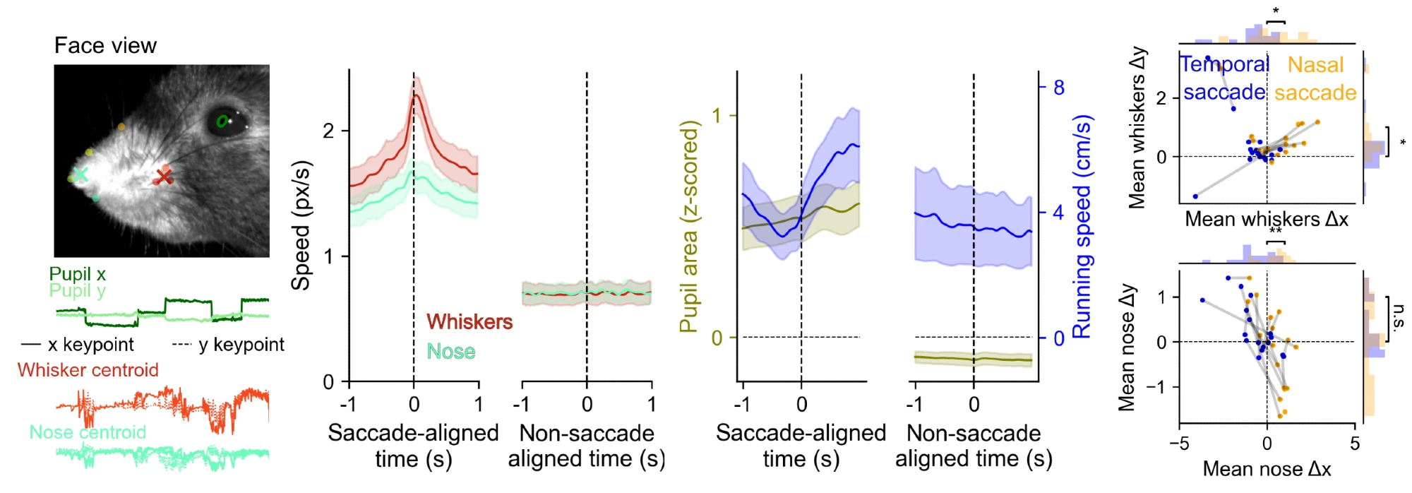 Spontaneous orofacial movements, such as whisking and sniffing, were also correlated to the time and direction of saccades in mice. This suggests orofacial behaviors play a key role in mouse visual processing which differs from primate vision highlighting species-level differences.