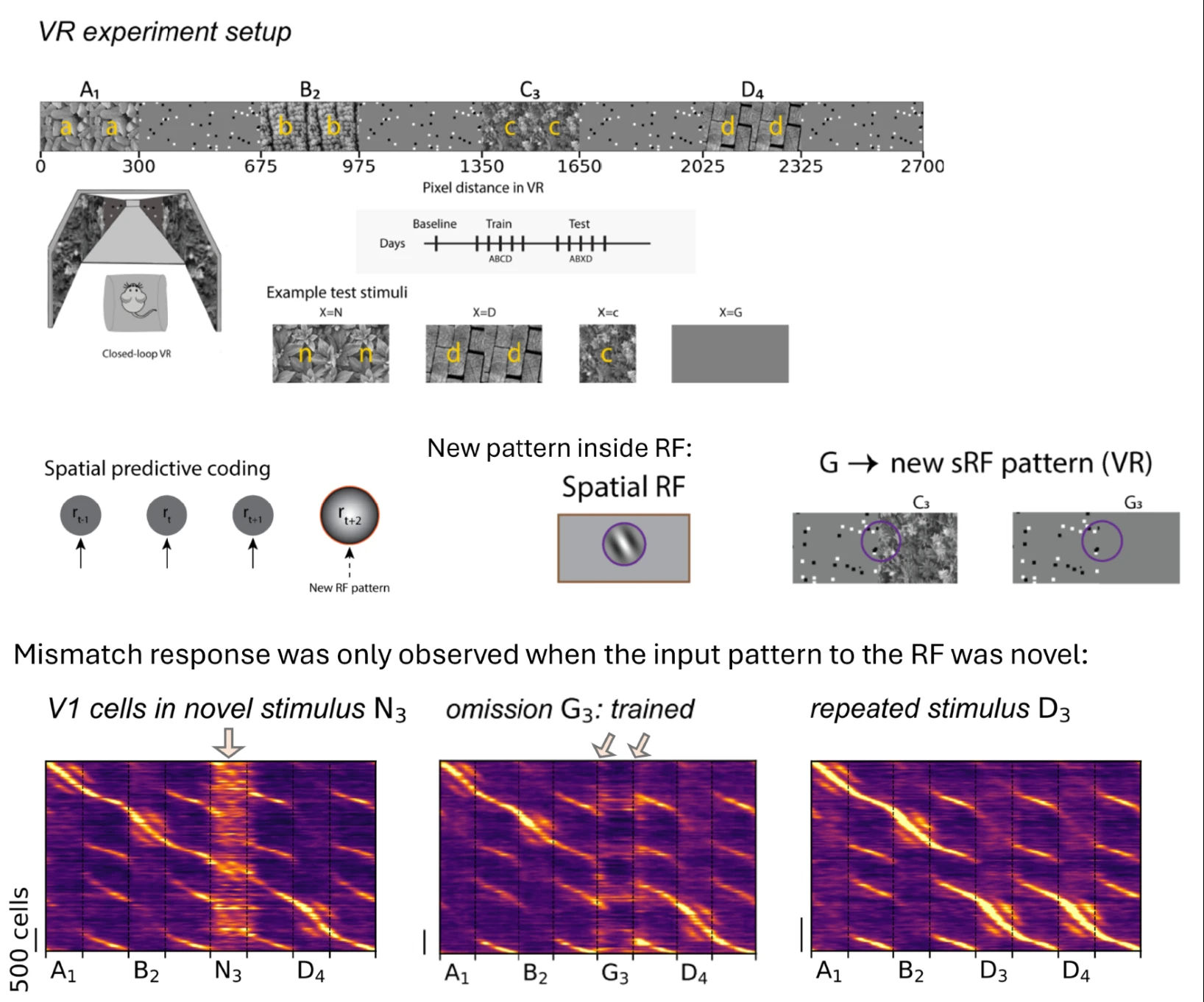 Predictive coding is a theoretical framework that can explain how animals build internal models of their sensory environments by predicting sensory inputs. Predictive coding may capture either spatial or temporal relationships between sensory objects. While the original theory by Rao and Ballard, 1999 described spatial predictive coding, much of the recent experimental data has been interpreted as evidence for temporal predictive coding. Here we directly tested whether the “mismatch” neural responses in sensory cortex are due to a spatial or a temporal internal model. We adopted two common paradigms to study predictive coding: one based on virtual-reality and one based on static images. After training mice with repeated visual stimulation for several days, we performed multiple manipulations, including: 1) we introduced a novel stimulus, 2) we replaced a stimulus with a novel gray wall, 3) we duplicated a trained stimulus, or 4) we altered the order of the stimuli. The first two manipulations induced a substantial mismatch response in neural populations of up to 20,000 neurons recorded across primary and higher-order visual cortex, while the third and fourth ones did not. Thus, a mismatch response only occurred if a new spatial – not temporal – pattern was introduced.